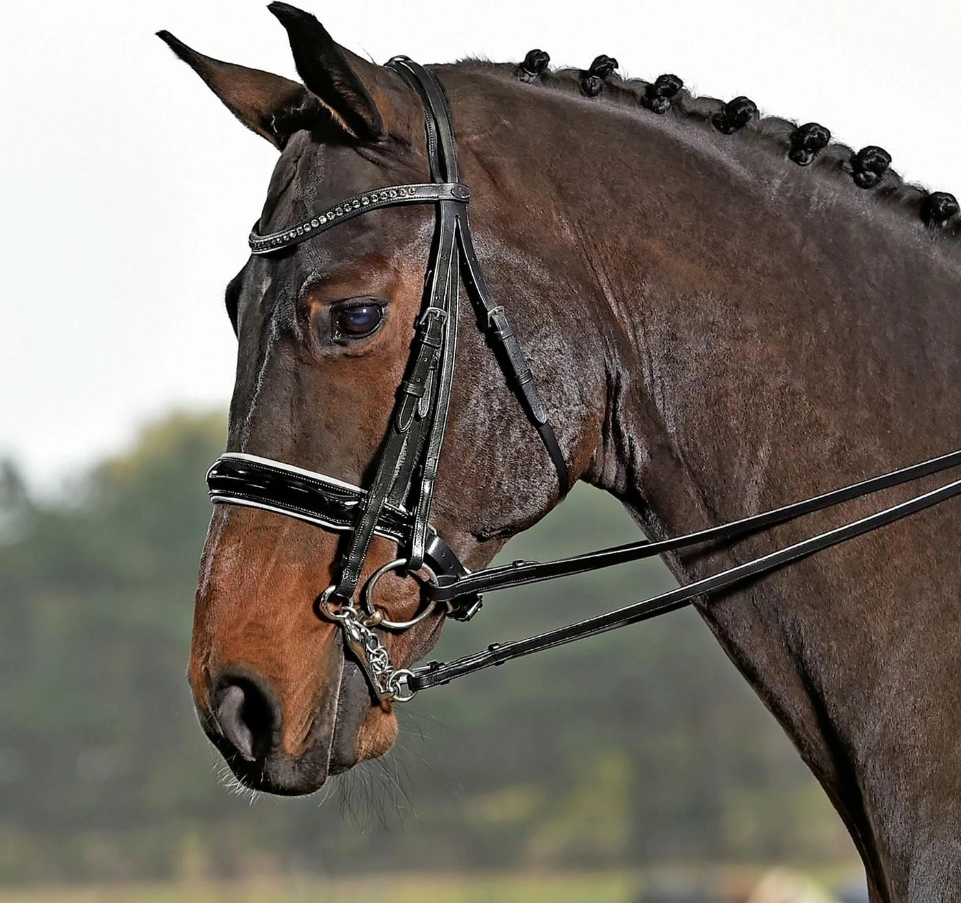- Enjoy a great fit and beautiful design all in one. The particularly durable patent leather on this bridle saves you time as it does not require daily polish. The patent leather noseband is soft, extremely wide, has a roller buckle closure and an integrated chin pad.