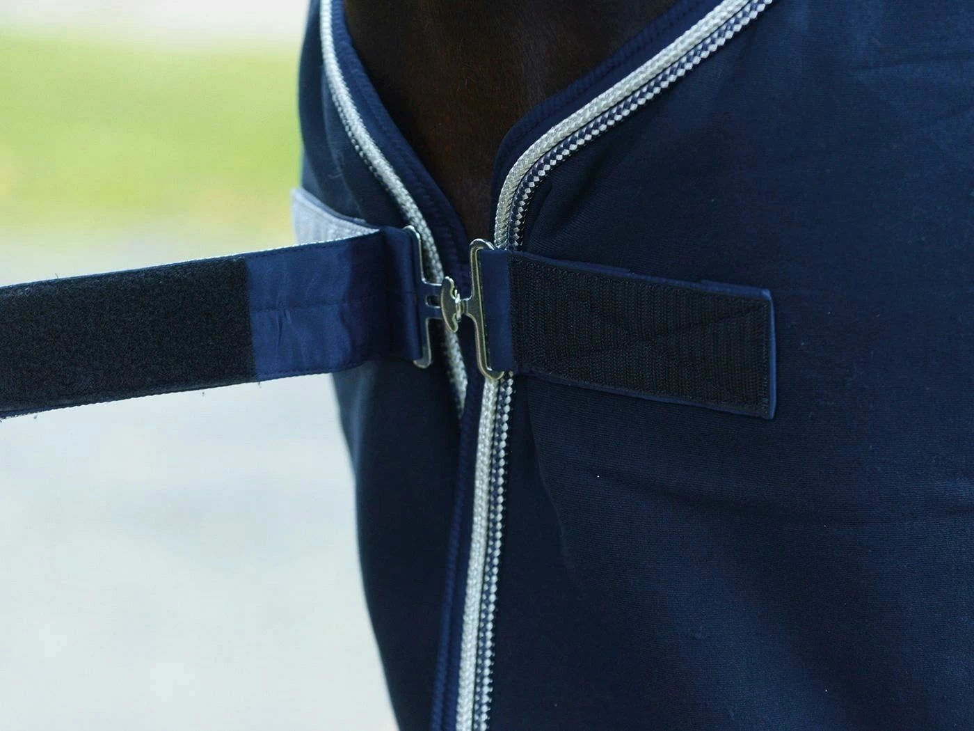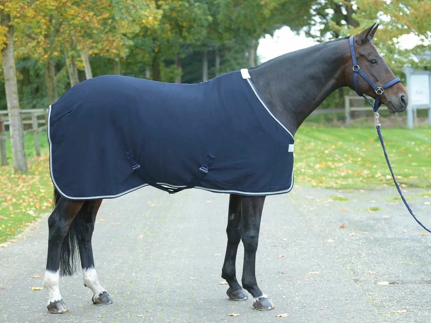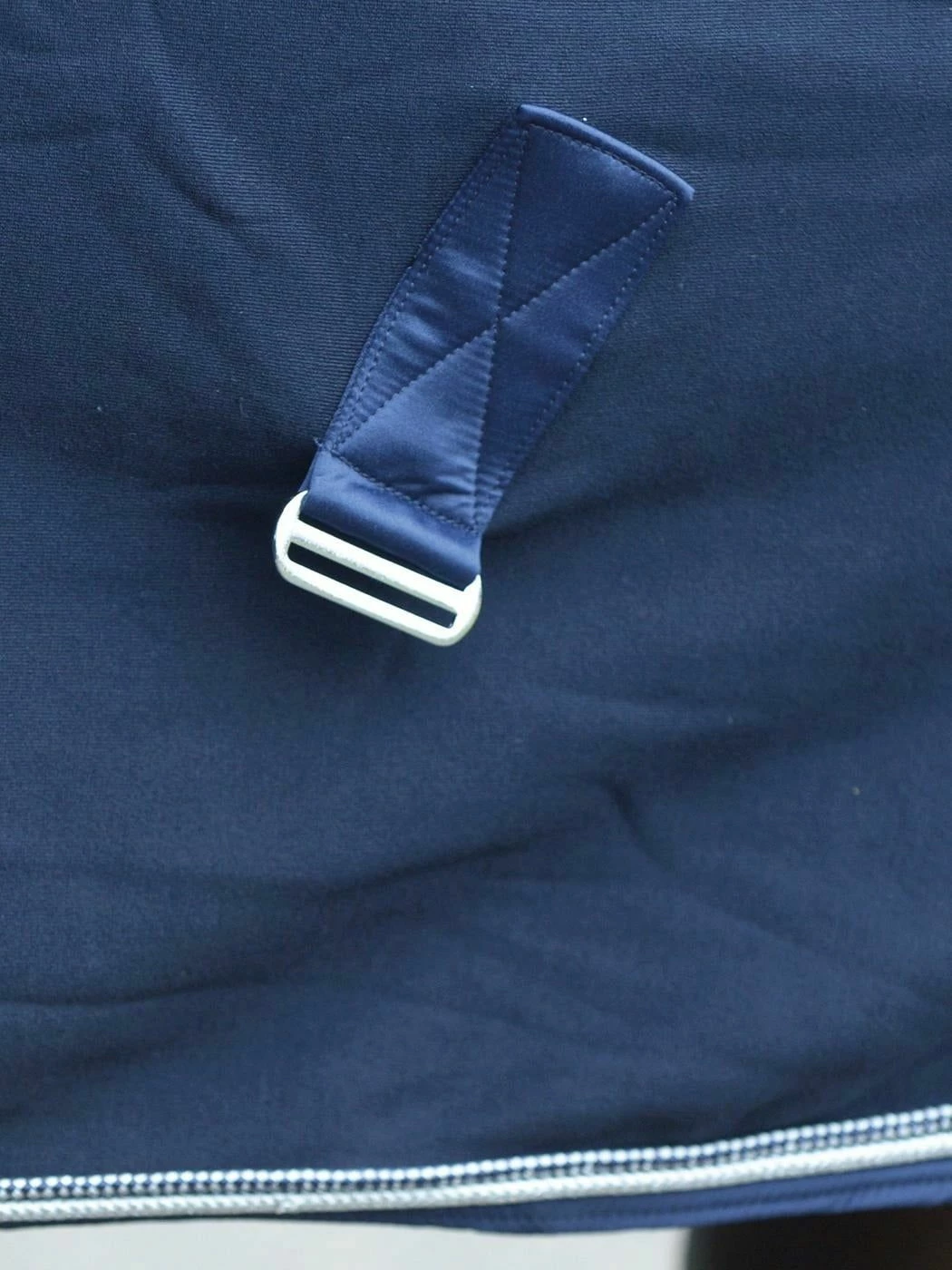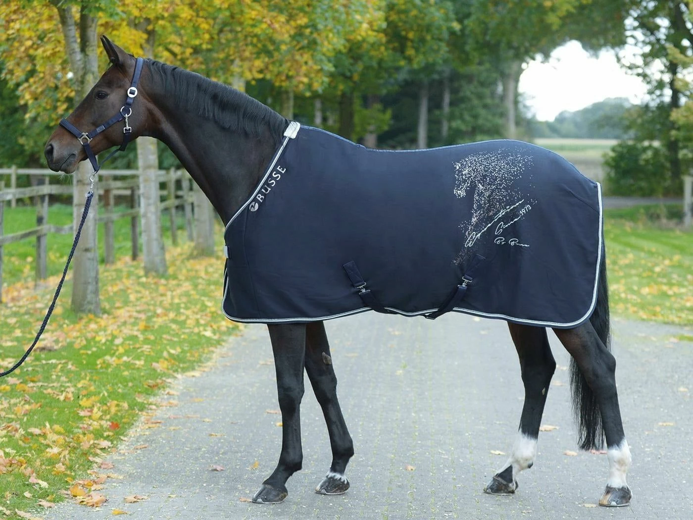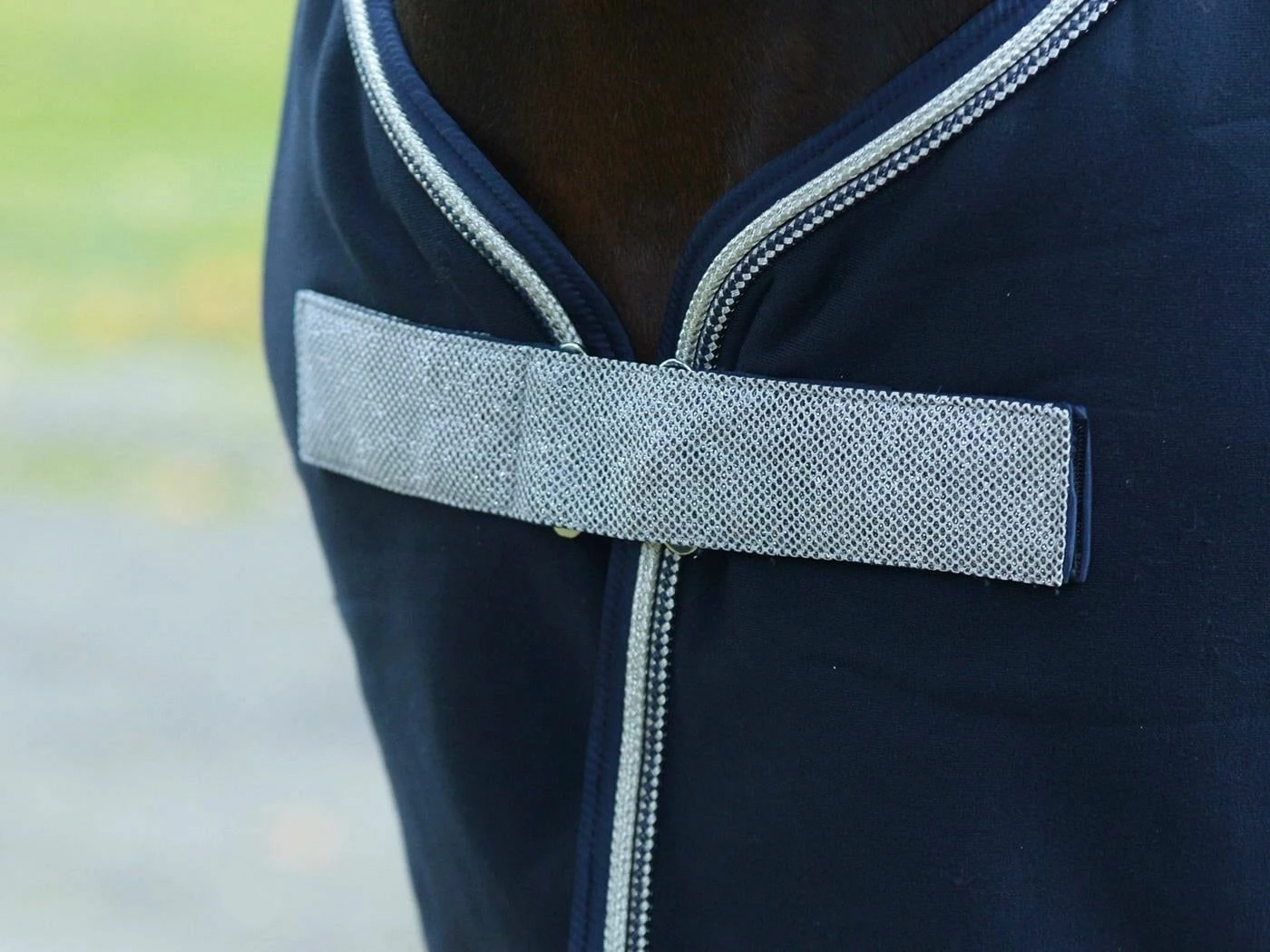 Rug made of breathable functional material that impresses with its elegant style. The artistic horse head as a silver print on the left side and the glittering elements on the chest fastener and as the border of the double decorative cord enhance the look immensely. The length-adjustable cross surcingles have a practical Velcro system and can be removed. This makes the blanket suitable for boxing and transport as well as for step riding.
