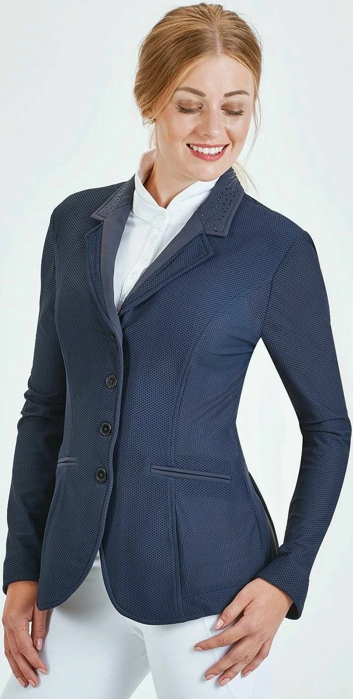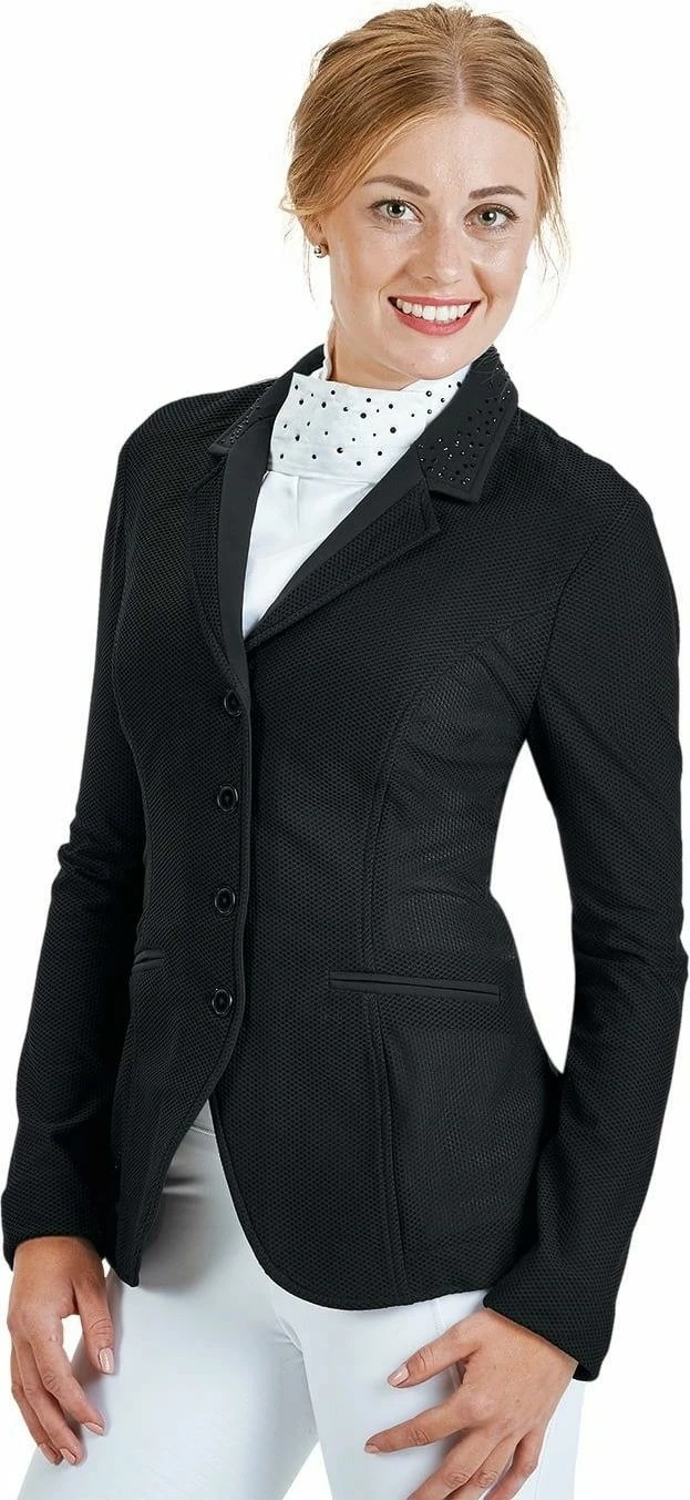Stylish competition jacket made of high-tech functional mesh material for particularly hot days. Waisted cut with articulated elbows. Perfect fit in the middle position thanks to the YKK® zip below the button placket. Almost opaque and can therefore also be worn with light or coloured shirts. Tone-on-tone rhinestones on the lapel collar and in the back of the waist area. Implied front pockets and mobile phone pocket inside.