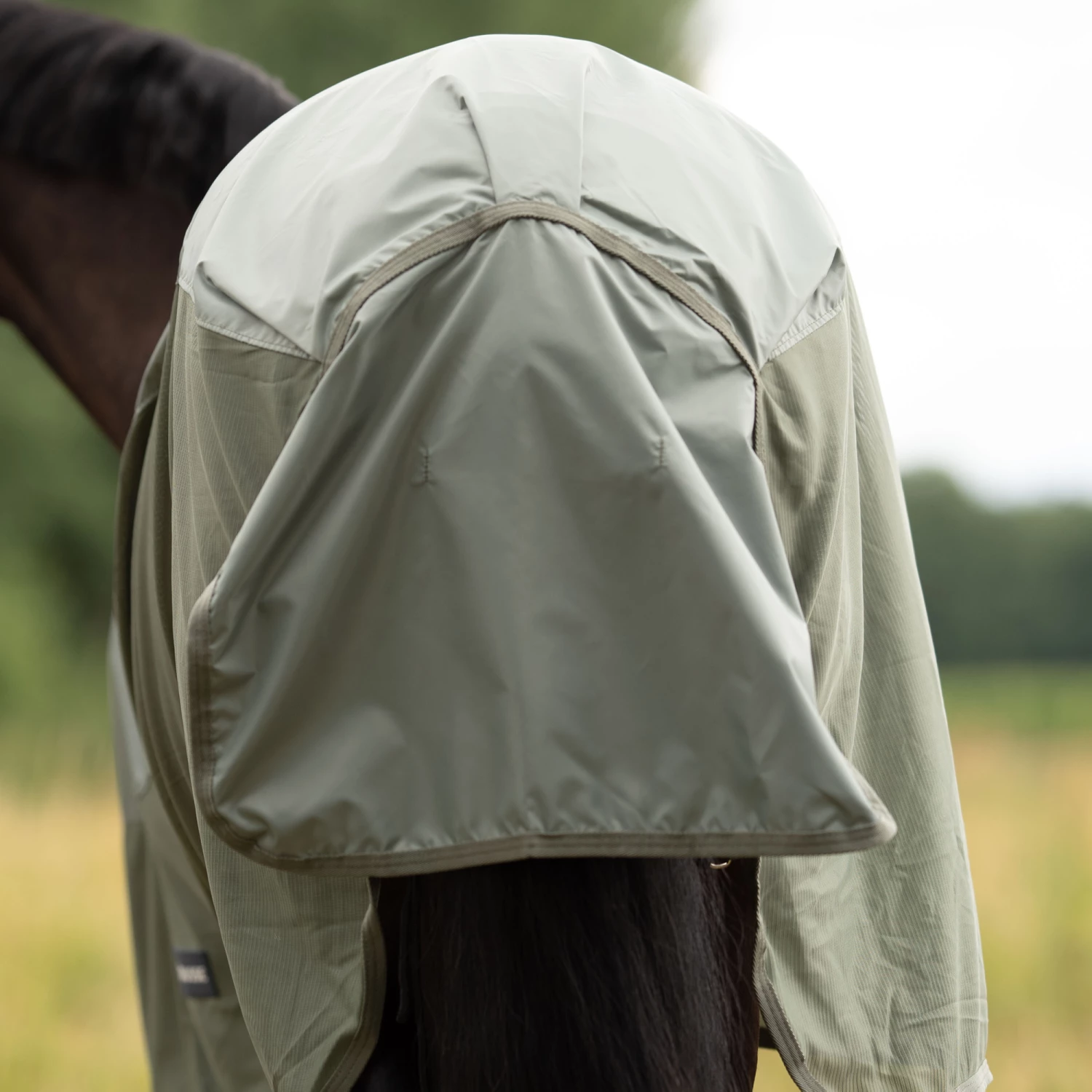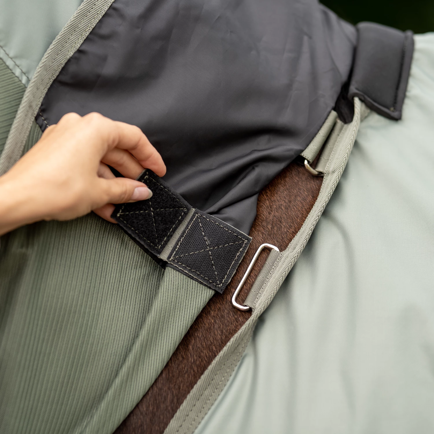 This breathable and durable combination rug helps to keep your horse’s back muscles dry while protecting against insects. The rug has a comfortable nylon lining and the side section is made of specially woven polyester and is particularly durable. There is a double T-closure with integrated double velcro in the chest area to keep the rug securely in place. The withers padding is made of synthetic rubber. The cross surcingle is adjustable in length. Includes a hind strap and a generous, lined tail cover.