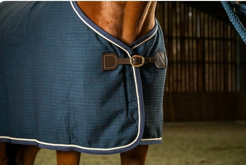 This outstanding sweat rug features an intricate woven pattern on the outer surface and has a functional cotton/polyester blend back. It is finished with a navy blue edging and a beige cord provides a matching contrast. In order to offer the horse the best possible comfort, the neckline is cut slightly higher and the withers are fitted with a soft pad made of synthetic lambskin. The manufacturer uses high-quality leather straps and a noble brass buckle for the breast closure. With discreet, beige Dyon lettering on the shoulder.