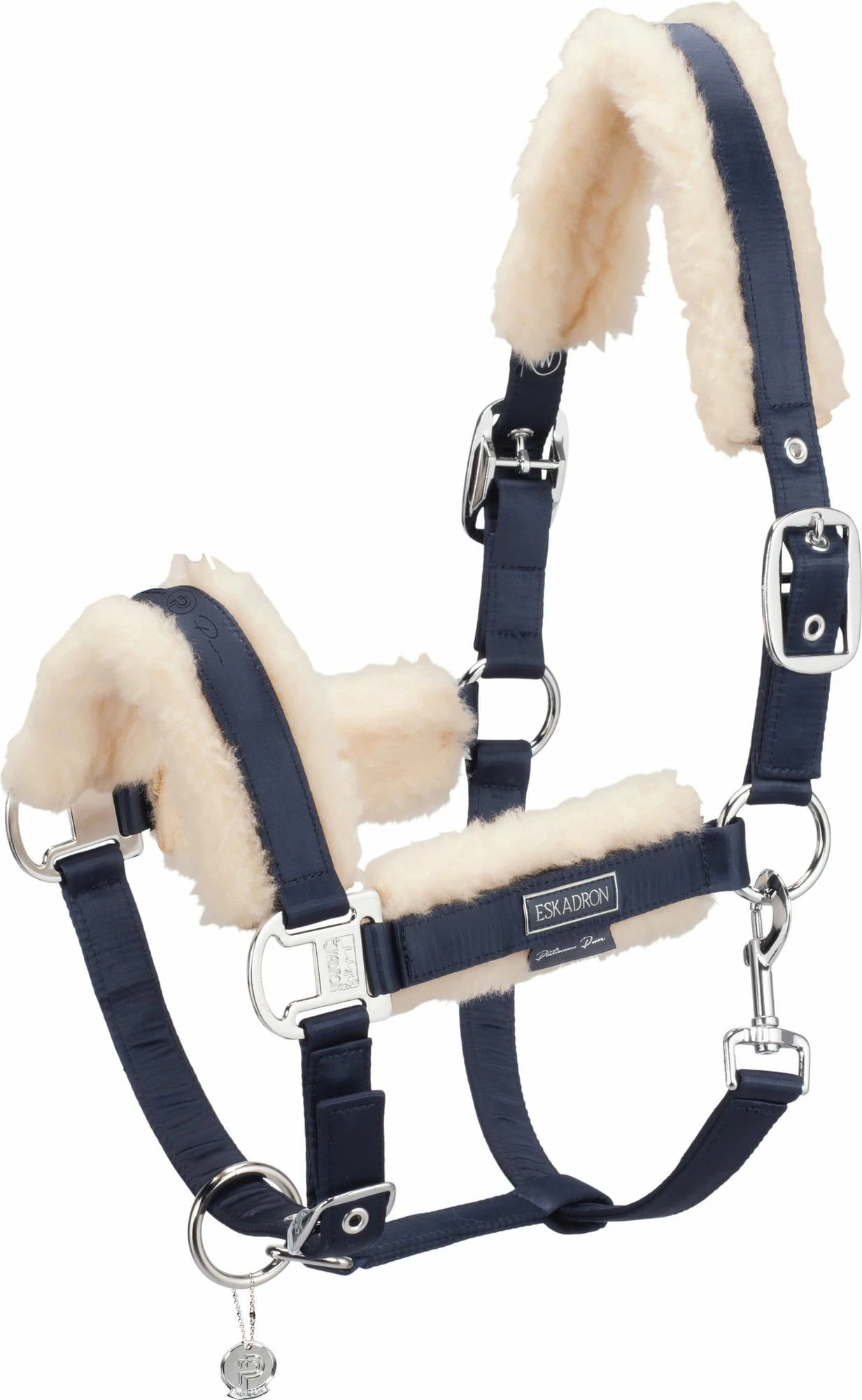 - An elegant Evo-Wool halter in timeless navy. The matte-gloss finish incorporates modern collection div and features high-quality, shiny silver buckles.
