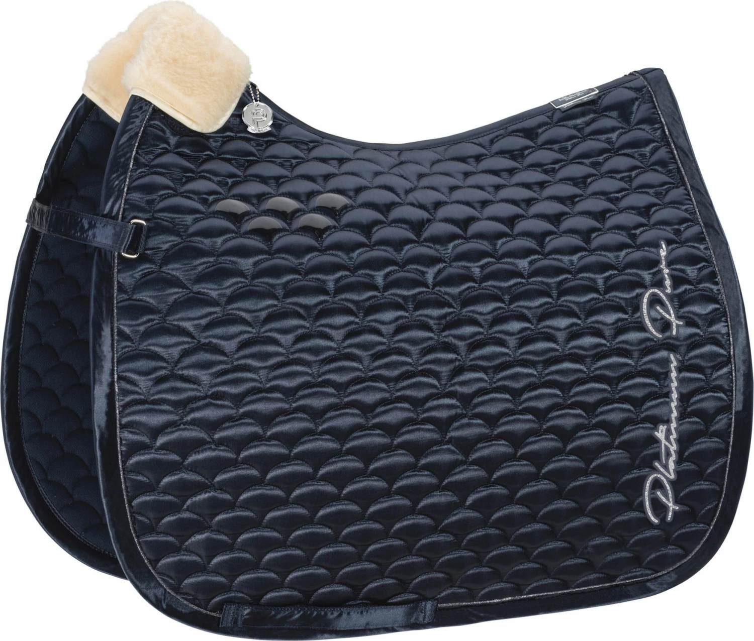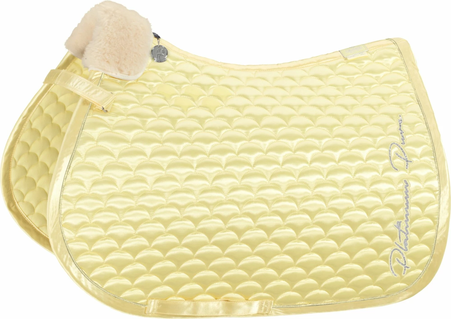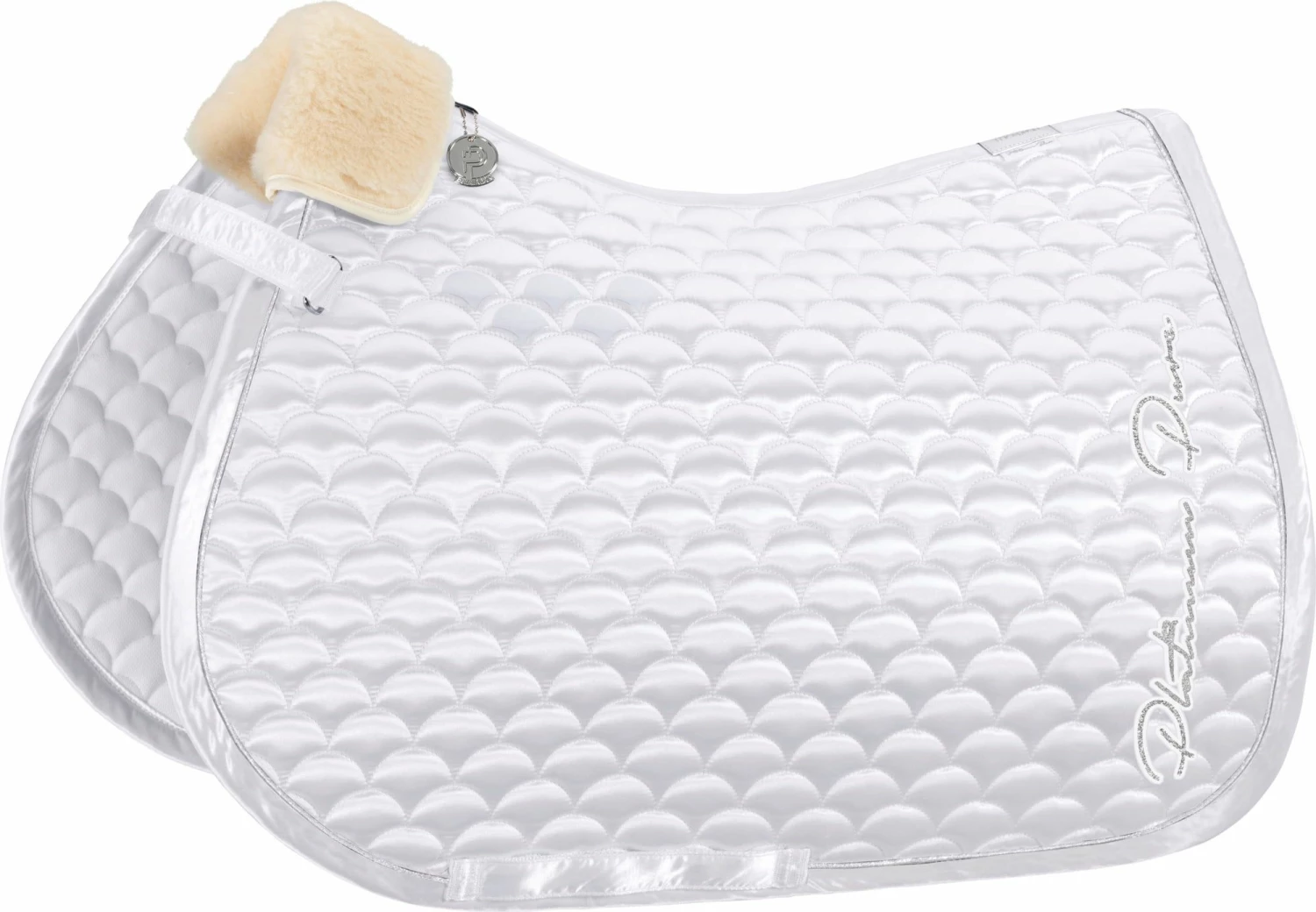 - An elegant saddle pad with gorgeous detailing. The beautiful cloud quilting is surrounded by satin edging in the same colour with Lurex piping. Elaborate Platinum Pure lettering on both sides adds the finishing touch.
