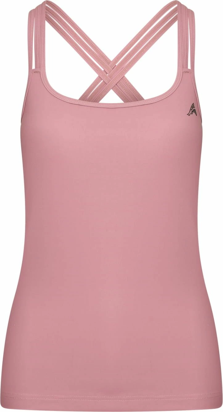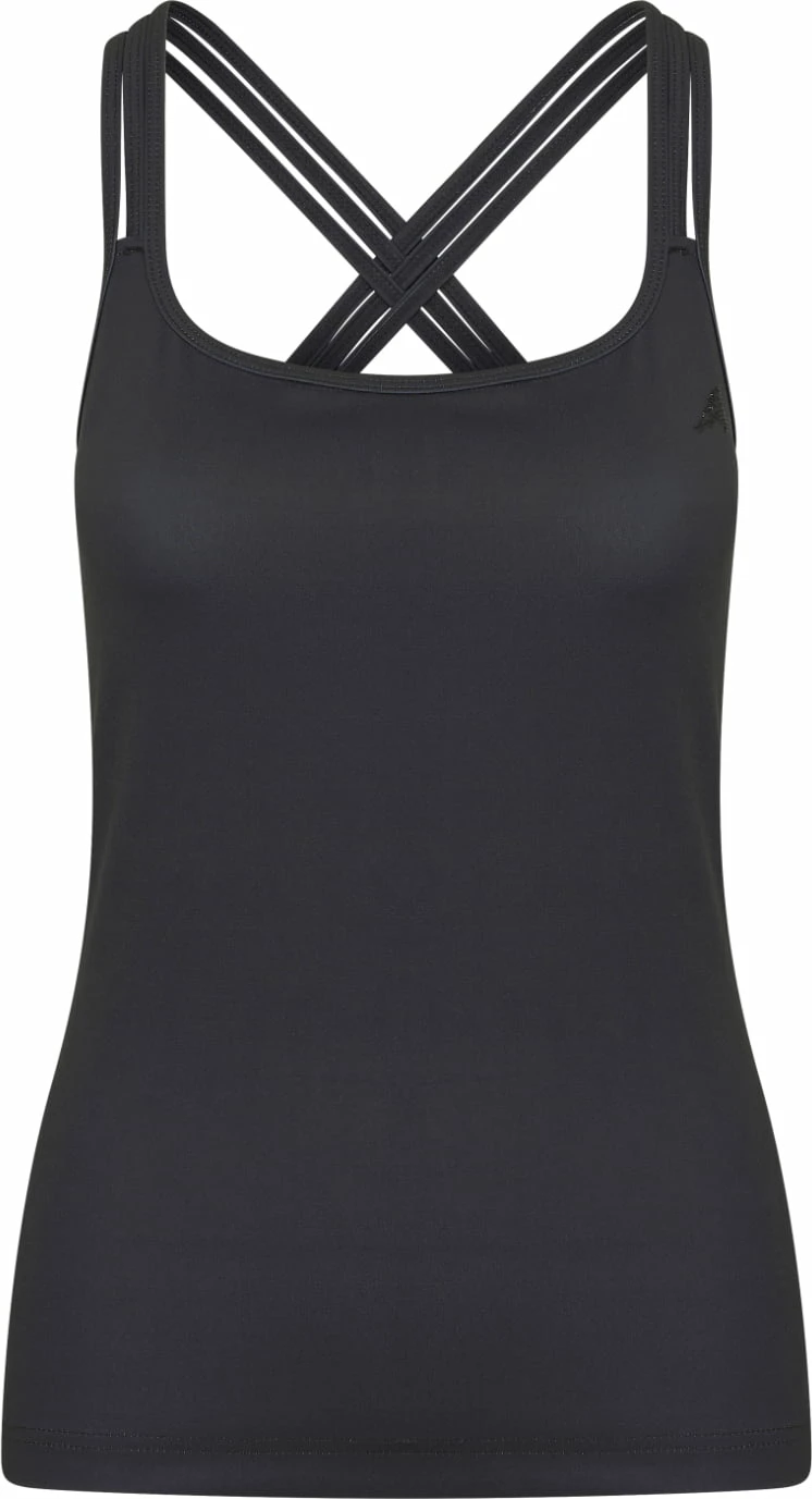 Sporty top with crossed shoulder straps. The three straps run into each other at the back. With logo appliqué on the left chest and a metal badge in the centre of the back.