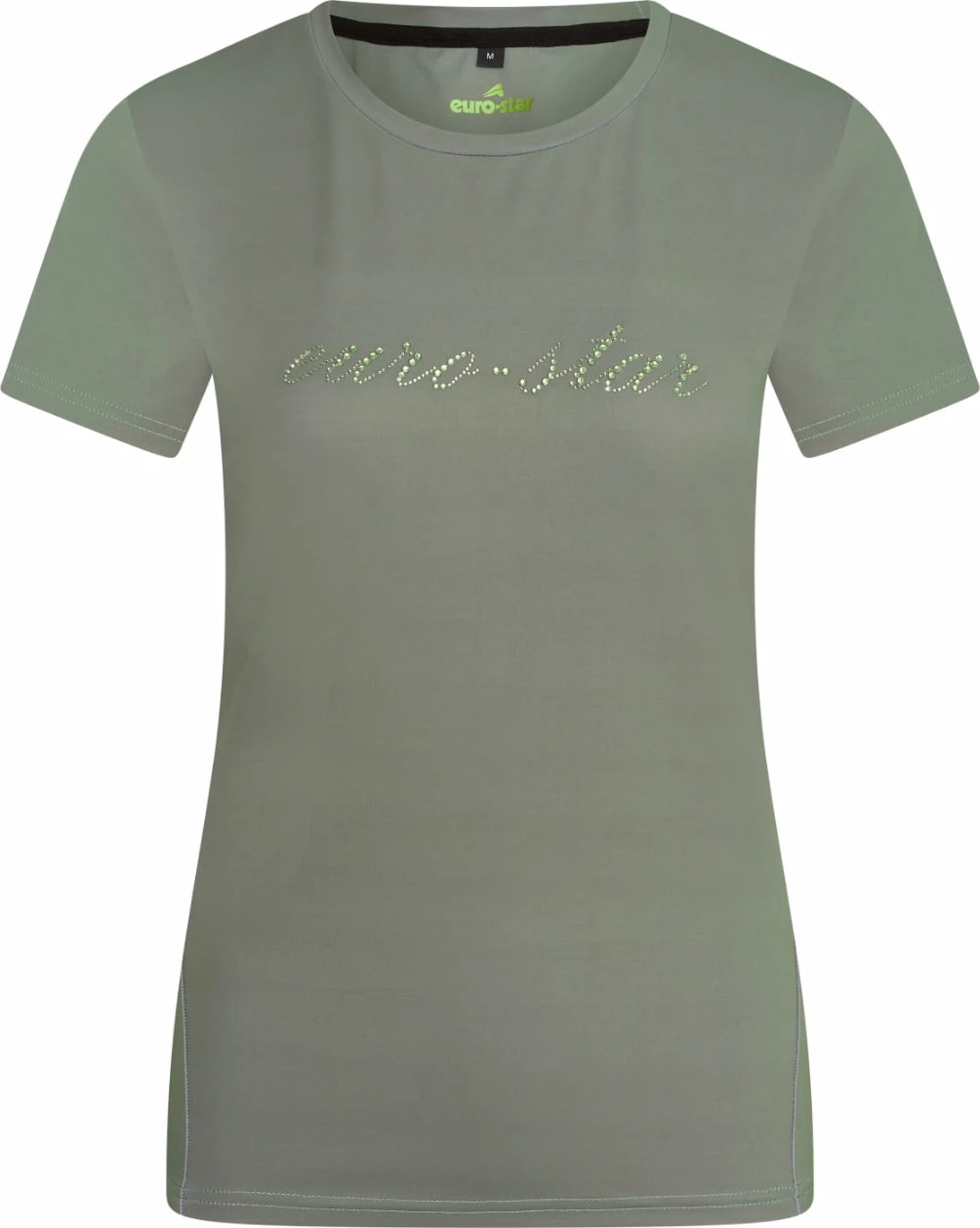 Summery T-shirt with a beautiful round neckline. Curved logo lettering made of rhinestones adorns the chest area. The cut is longer at the back. Curved seams emphasise the feminine shape.