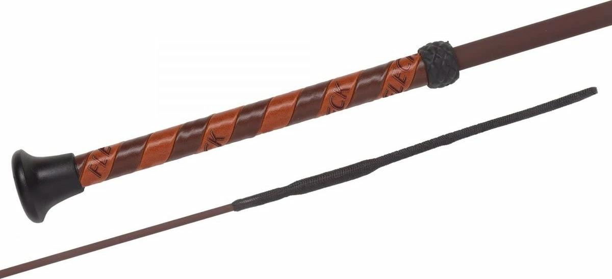 This attractive dressage whip has a fibreglass core with SilkTouch coating and a two-tone synthetic leather handle. The plastic button at the end prevents the crop from slipping out of your hand.