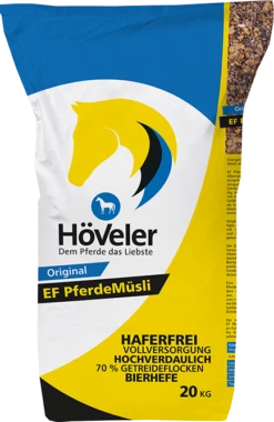 The original EF Horse Muesli is entirely free from oats, but with a cereal content of over 70%. The cereals, such as maize, barley and wheat flakes, are chosen because the starch they contain can be digested quickly and completely in the small intestine. This is why the recipe – which also includes alfalfa, wheat bran and molasses – is also ideal for horses with sensitive digestive systems. Brewer’s yeast, which is rich in B vitamins, supports the flora of the large intestine. Molasses ensure that the muesli is both delicious and dust-free.