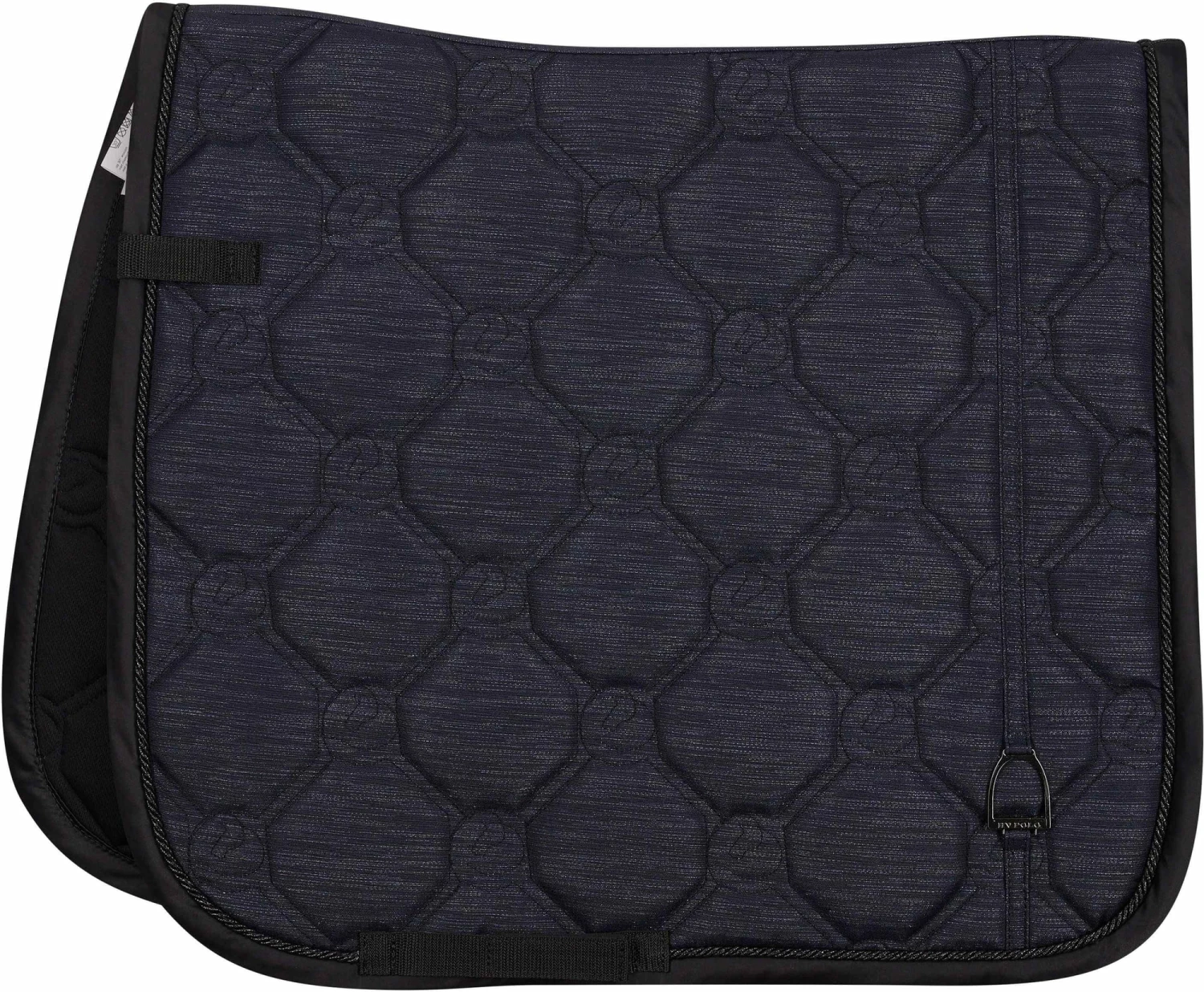 - This dressage saddle pad features beautiful shimmering fabric and an elaborate quilted pattern. It has a wide hem and an elegant cord that encircles the saddle pad as well as a HV Polo logo on a small decorative stirrup.