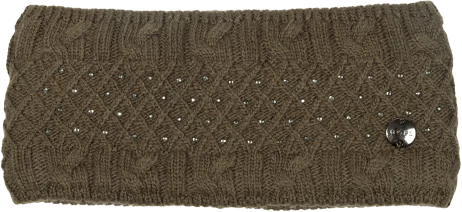 This pretty headband combines cable knit with a diamond pattern. The design features sparkling rhinestones in the individual diamonds and a dainty metal logo.
