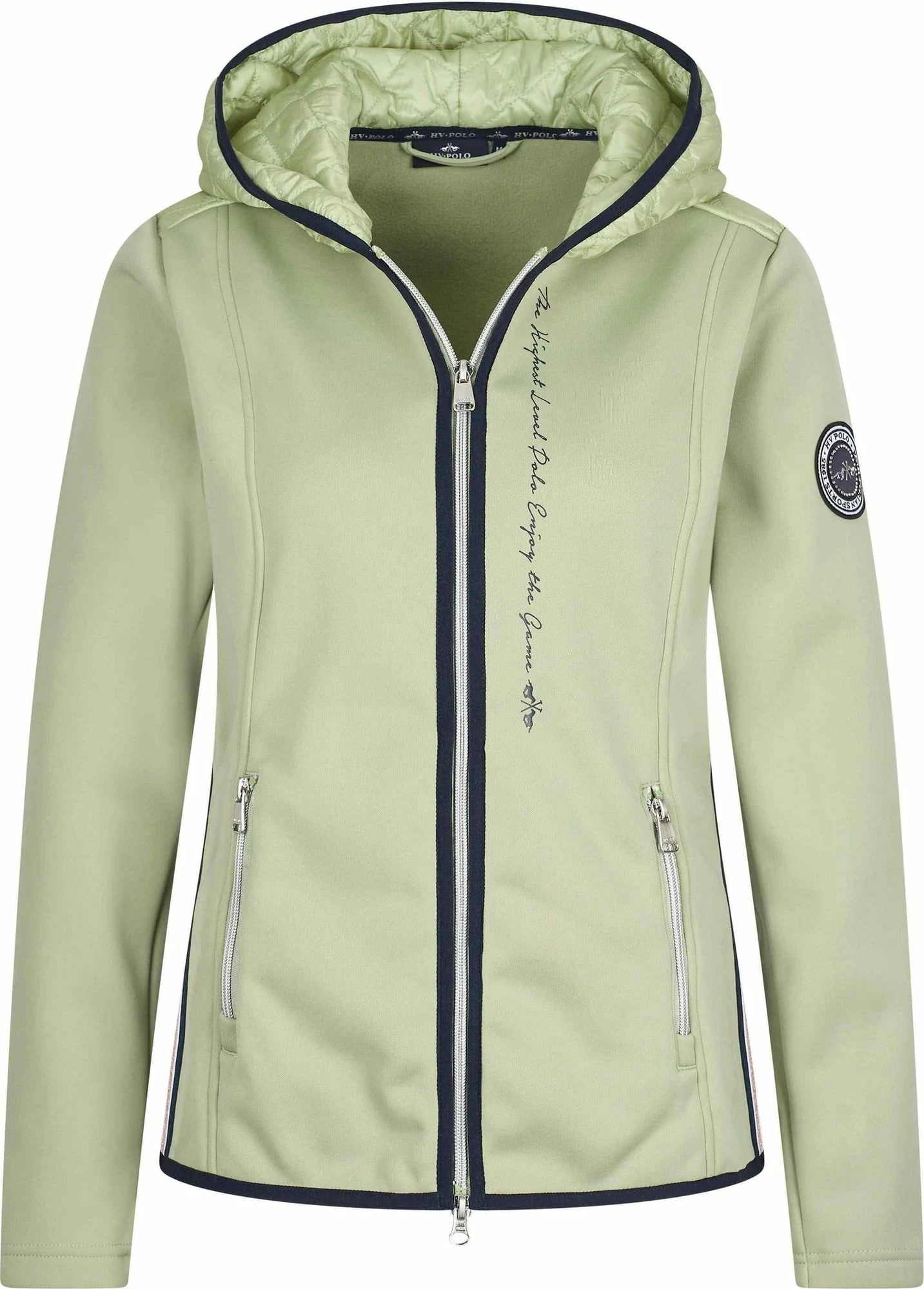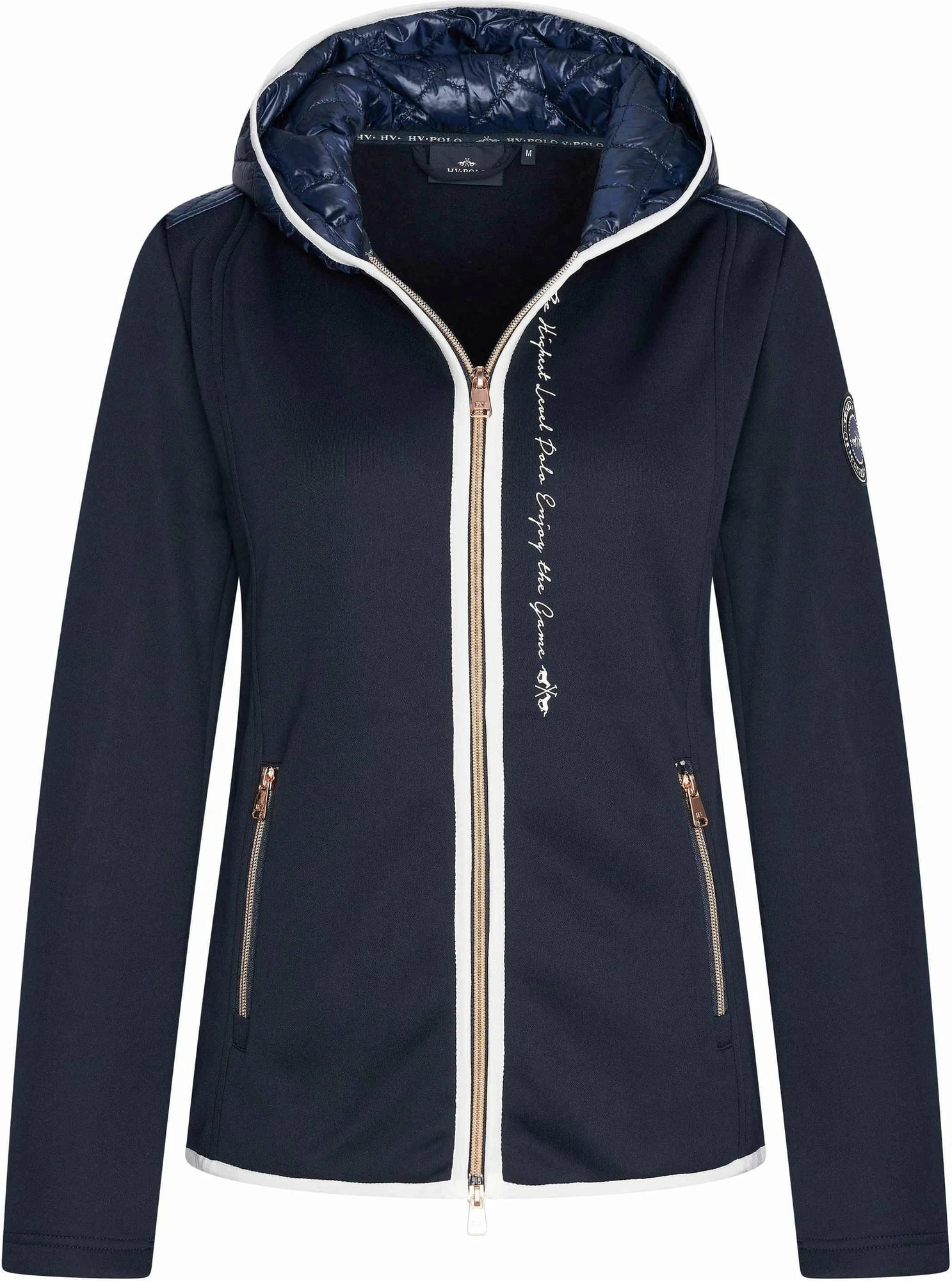 - Vertical lettering along the zipper, contrasting edging, and silver zips add a special touch to this comfortable tech jacket. The elegant quilted pattern on the inside and outside of the hood as well as on the shoulders is an additional highlight.