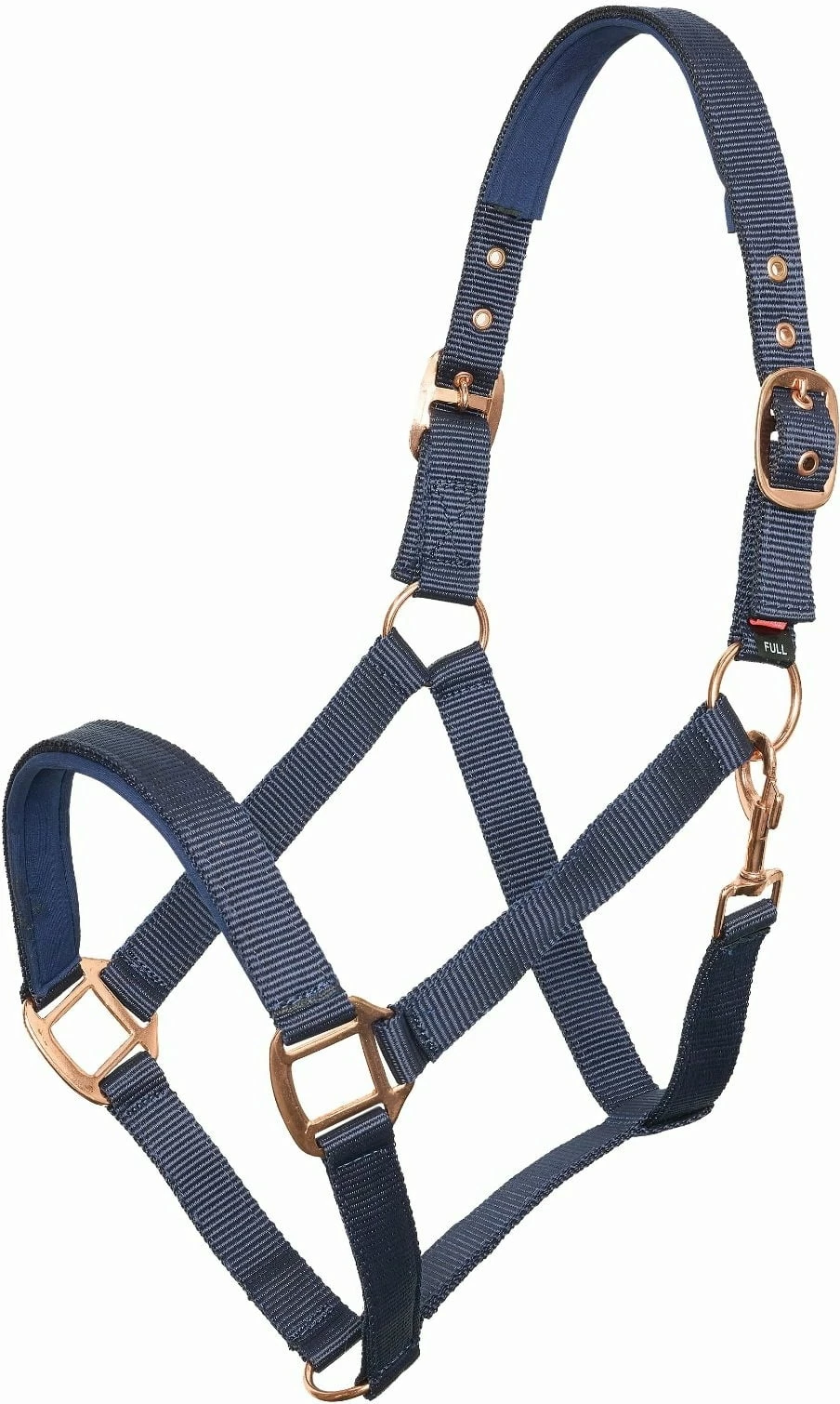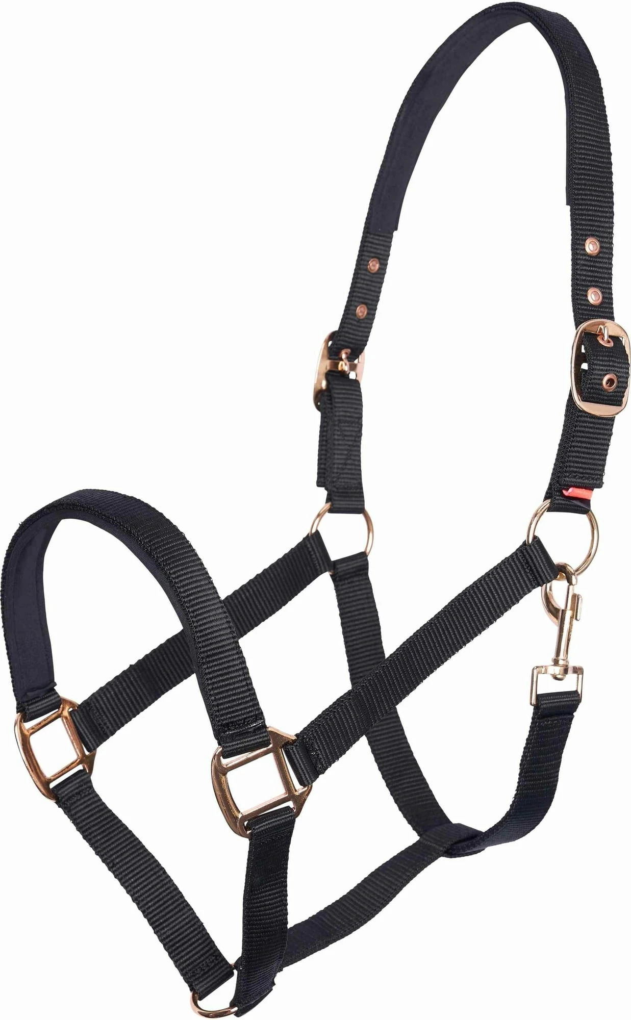 - This high-quality nylon halter is lined with soft neoprene in the nose and poll and protects your horse’s head from chafing. Rose gold fittings add a lovely colour accent. The bridle can be adjusted on both sides.