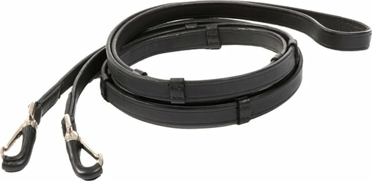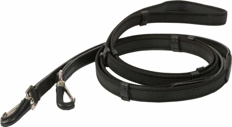 The rubberised reins are shorter in length (1.30 m) than conventional reins and are ideal for Icelandic horse sport. Their width of 16 mm and the texture of non-slip rubber provide a good grip in the palms of the hands. Another special feature is the fixed headpiece of the reins and its leather-covered carabiner.