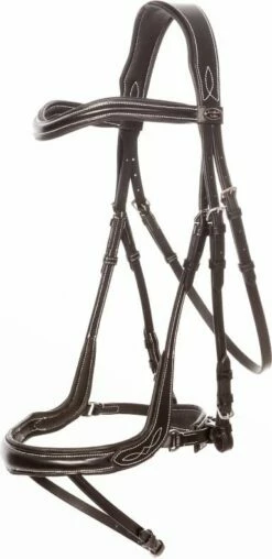 The soft quality leather is padded at the neck and on the nose. The headpiece has an anatomical shape and is particularly wide cut. Contrast stitching and decorative embroidery on the side make for a chic look.