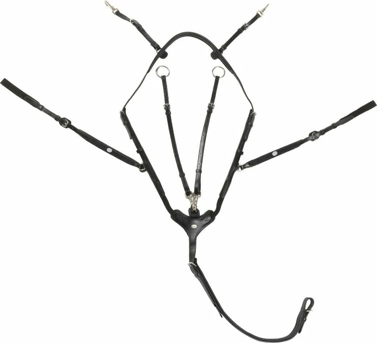 The narrow 5-point breastplate is also equipped with elastic inserts and can be adjusted several times. The buckle with adjustment option is attached to the front of the breast on this breastplate in order to avoid annoying fiddling around in the abdominal area.