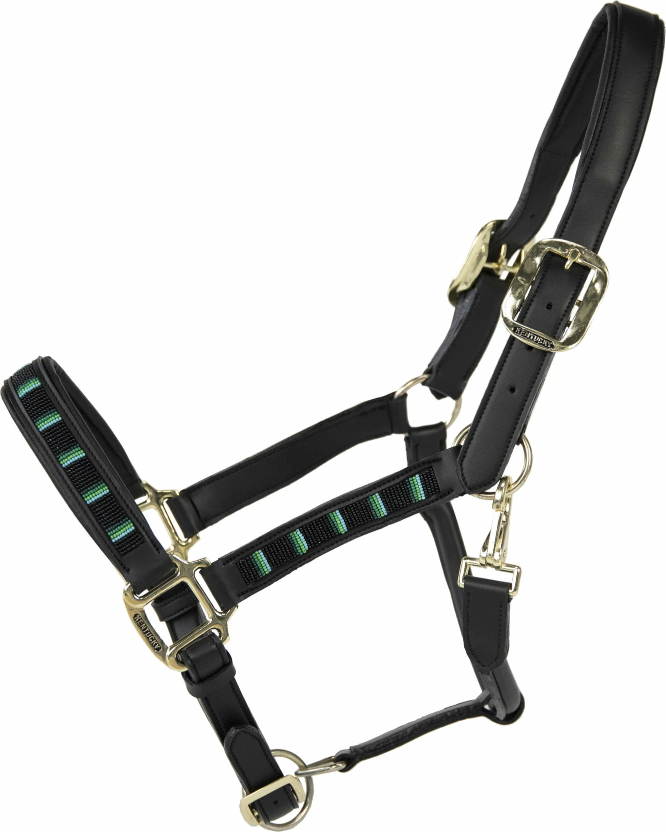 This halter combines the easy-care and robust advantages of animal-friendly synthetic leather with chic div of beads and elegant, gold-coloured fittings. The durable material can easily be exposed to sunlight and water without hardening and discolouring. For an optimal fit, the halter can be adjusted to the individual head shape of the horse on both sides of the head and additionally in the area of the jaw.