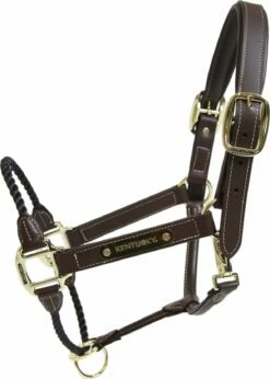 With this special halter, the noseband is replaced by a thick brown rope. This allows strong-tempered horses to be controlled easier. If the horse pulls too hard, the noseband contracts. The rest of the halter is made of sustainable and easy-care synthetic leather. To achieve an optimal fit, the neck piece can be adjusted on both sides.