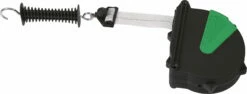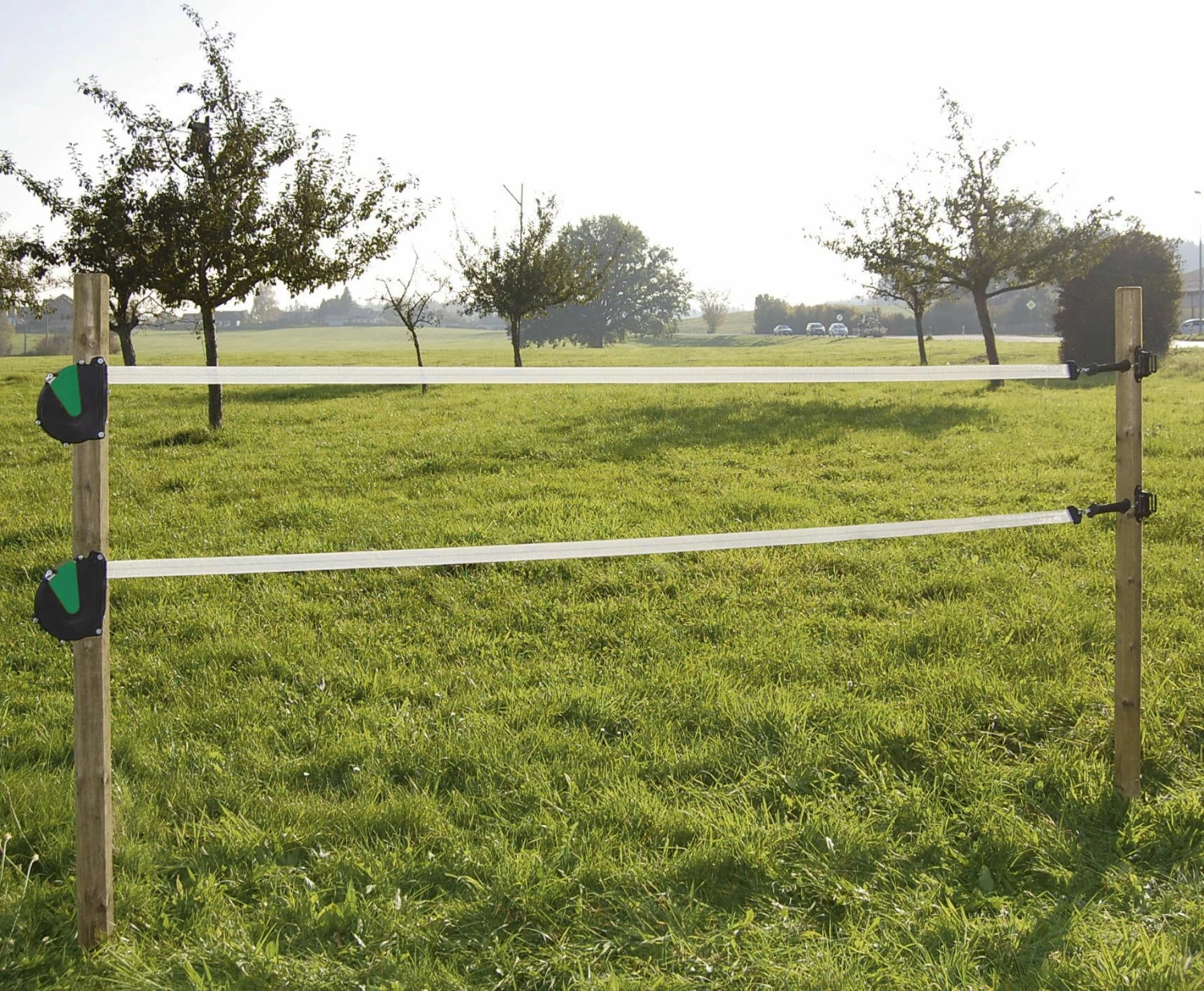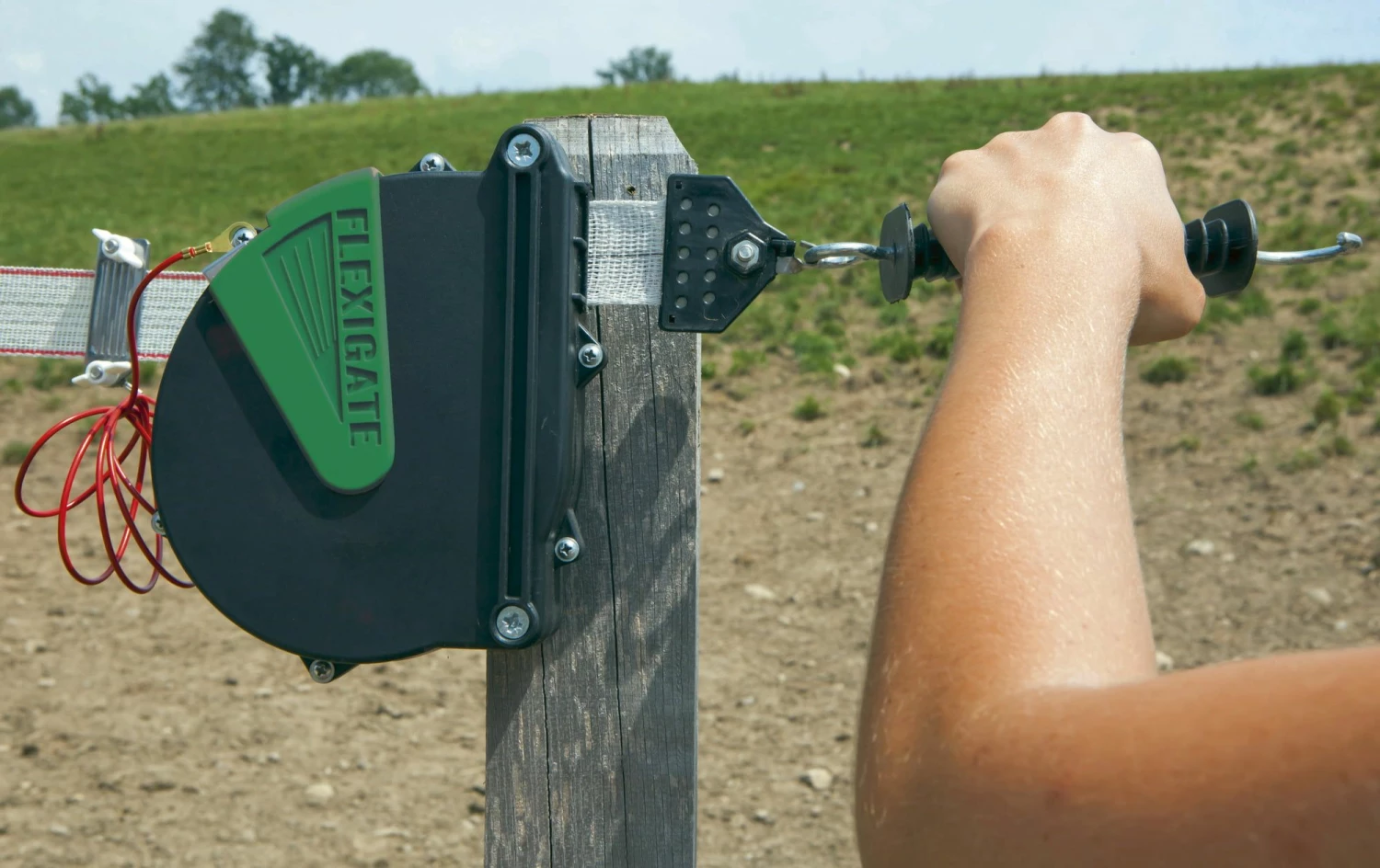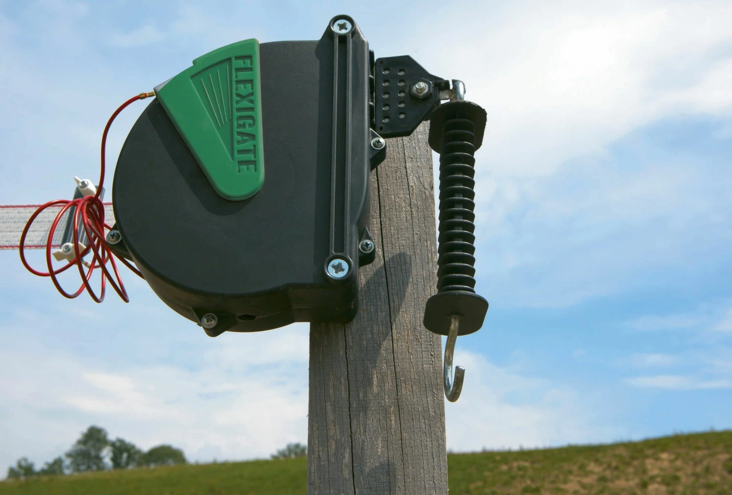 A flexible gate system with which paddock entrances can be easily and conveniently continuously energised. Each time it is opened, the conductive material is rolled up by a steel spring.