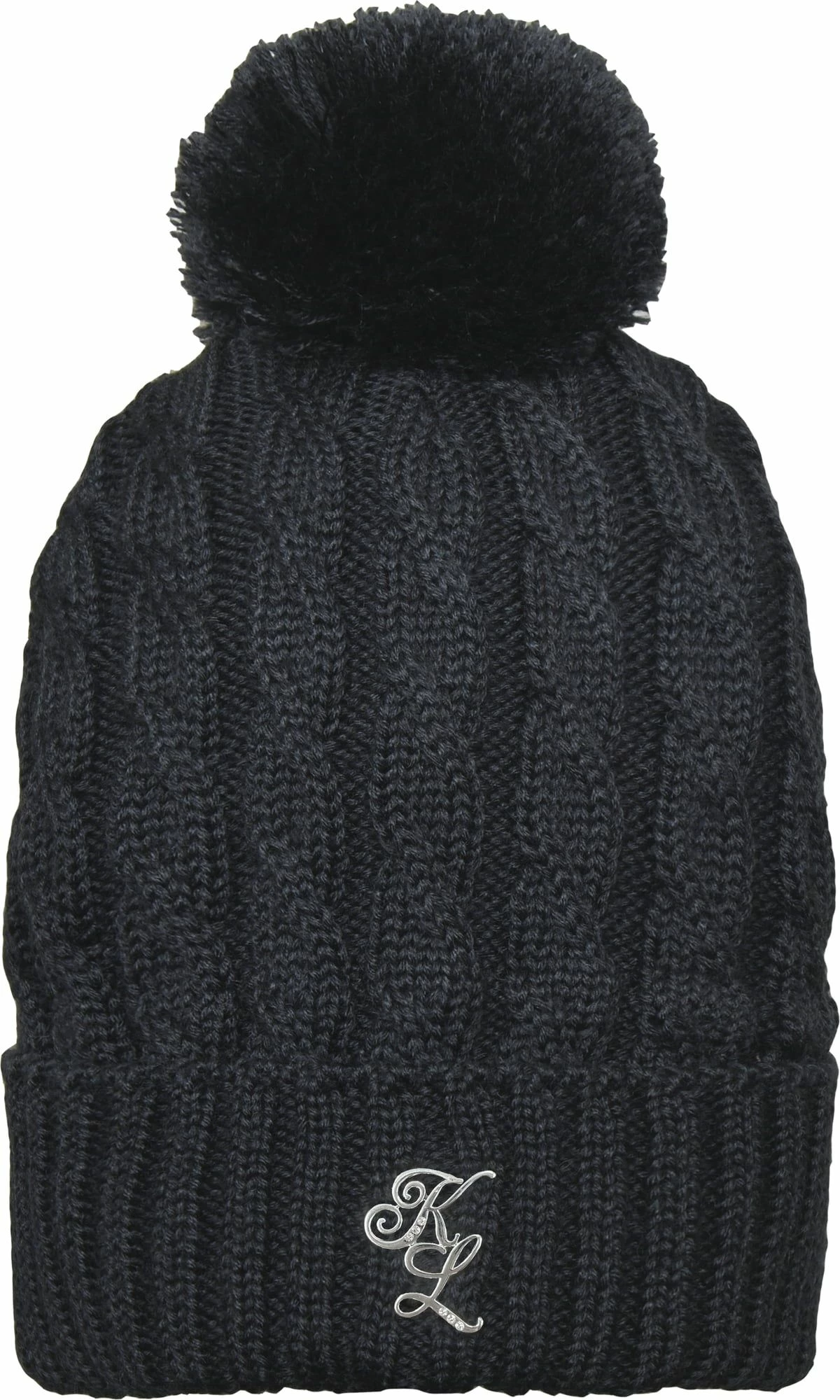 This cable-knit bobble hat is made from high-quality wool-blend yarn. The inside made of soft fleece keeps your ears, head and forehead pleasantly warm. The hat is trimmed with a fluffy pom-pom and has a small ornate metal KL logo with rhinestone detailing.