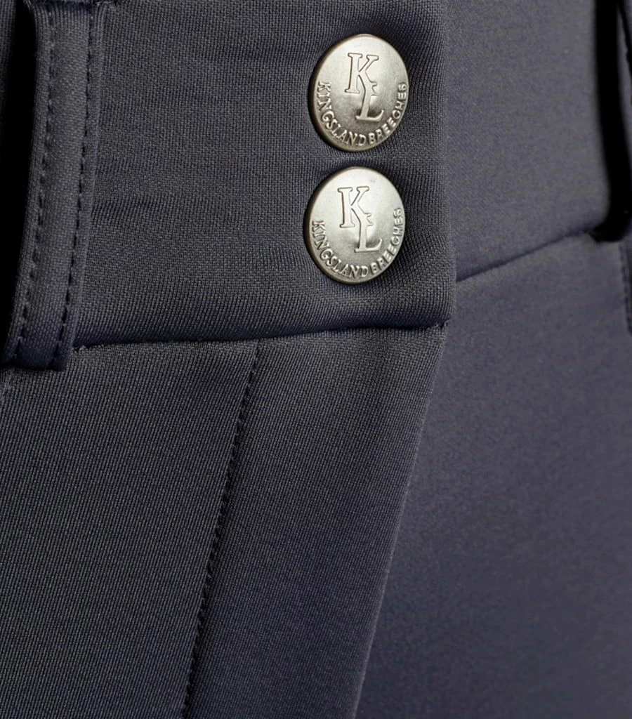 - Design highlights include two buttons on the wide waistband, fake pockets on the front of the breeches and tonal piping along the side panels.