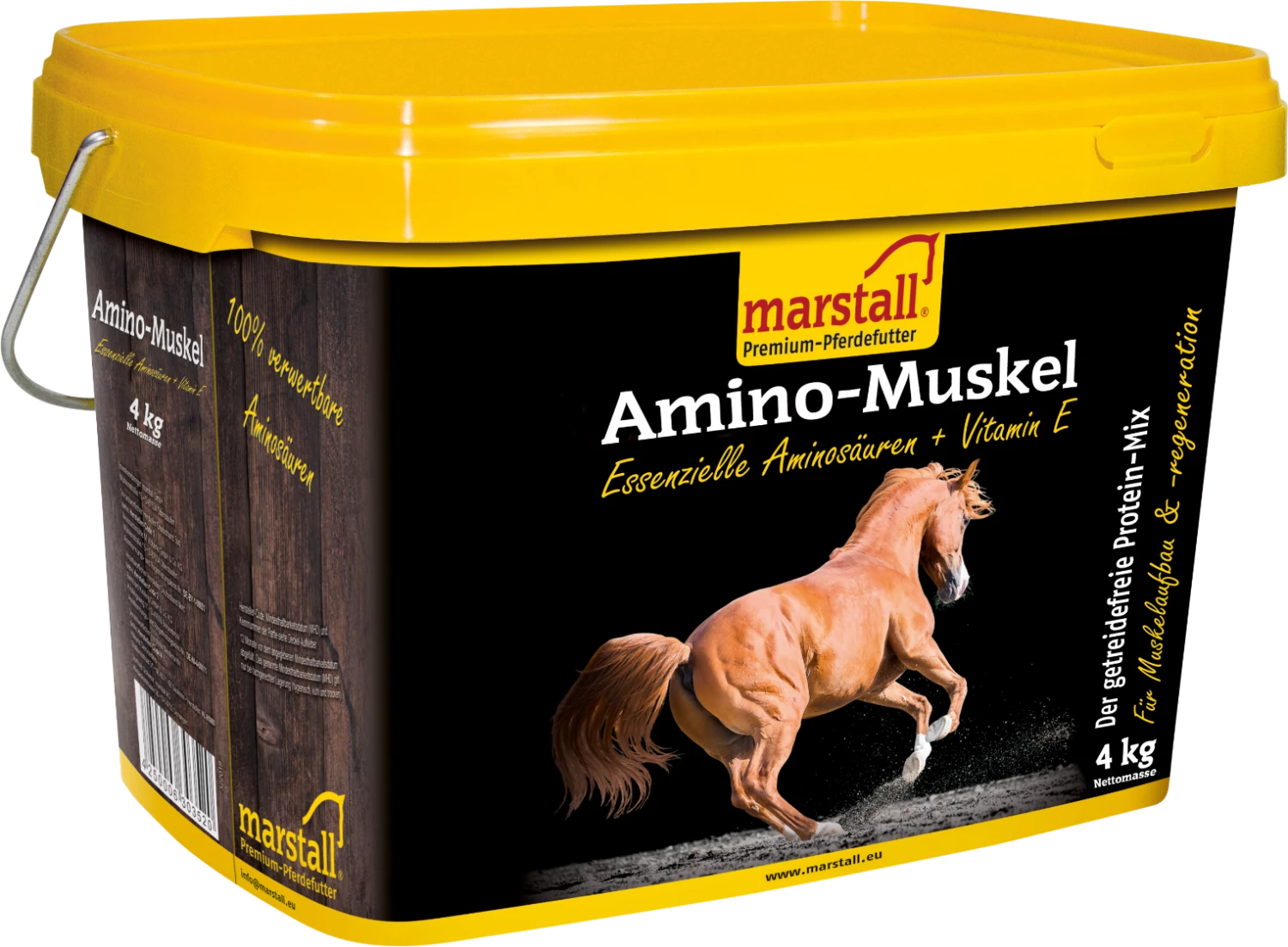 Amino Muscle contains essential amino acids in concentrated form as well as vitamin E. The grain-free formula is therefore suitable for all horses and can be fed to support muscle development and for shortened regeneration phases. It is low in starch and sugar, and produced entirely without soya.