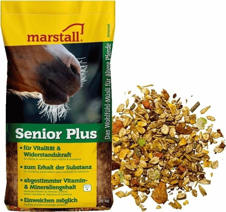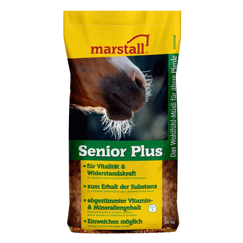 This tasty Senior Plus blend is precisely adapted to the needs of older horses or convalescent horses. The feed is made with highly digestible energy sources, such as hydrothermally processed cereal flakes. Brewer’s yeast, flaxseed meal and pea flakes are among the protein-rich nutrients that could support normal coat shedding and muscle growth. The recipe is enriched with valuable linseed, tasty carrot flakes and apple pomace. These components provide high-quality omega-3 fatty acids, vitamins and fibre. The seaweed also contains a vitamin complex of vitamins A, E, B and C. In addition, the Senior Plus feed is enriched with trace elements. Senior Plus can support the metabolism and is also suitable for body building in horses of all ages.