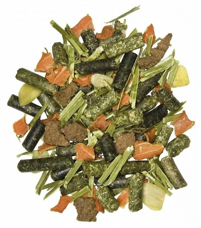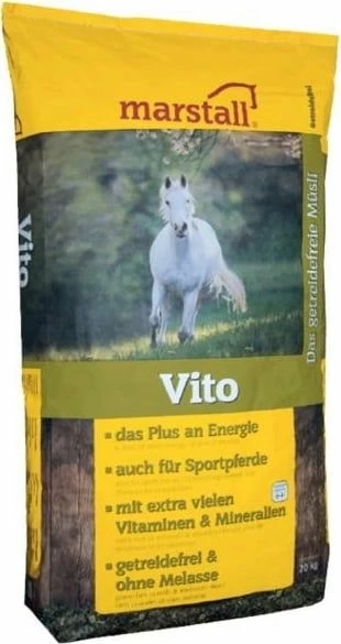 Vito is based on loose or pressed hay fibres, oil and a mineral/vitamin mix, enhanced with tasty natural components such as carrot and garlic flakes. Thanks to the high oil content, Vito can also be supplied with grain-free energy for sport horses. It is also possible to feed the special feed soaked (1 litre Vito with 1 litre of water).