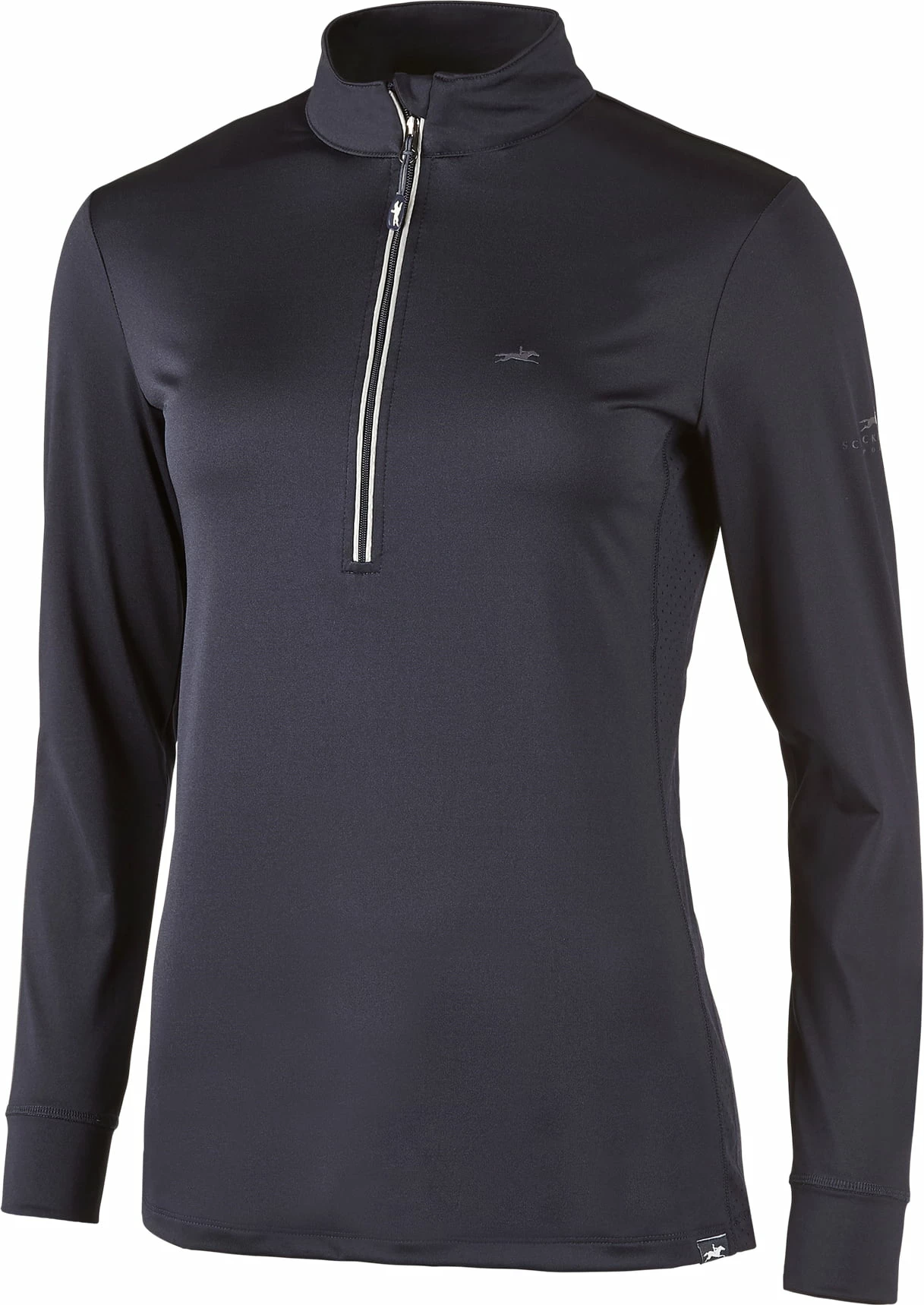- A half-zip on the shirt front and subtle logo embellishments on the chest, back, sleeves, and hem ensure a sleek and modern design.