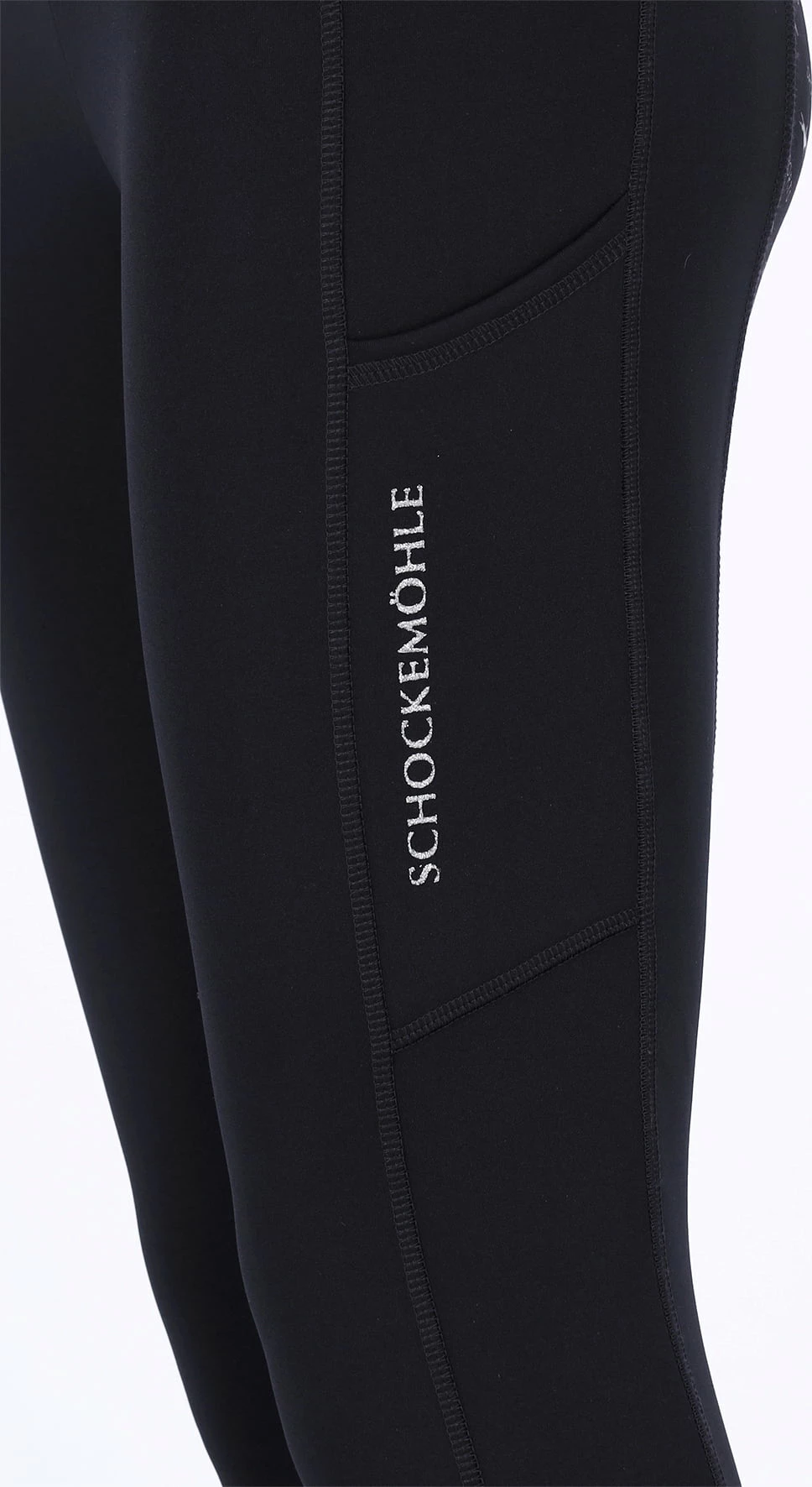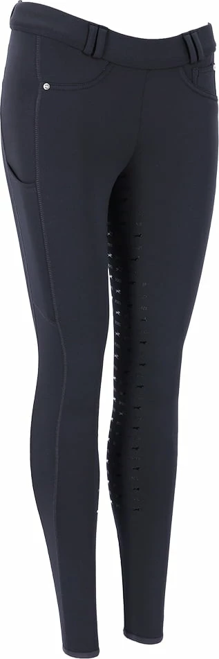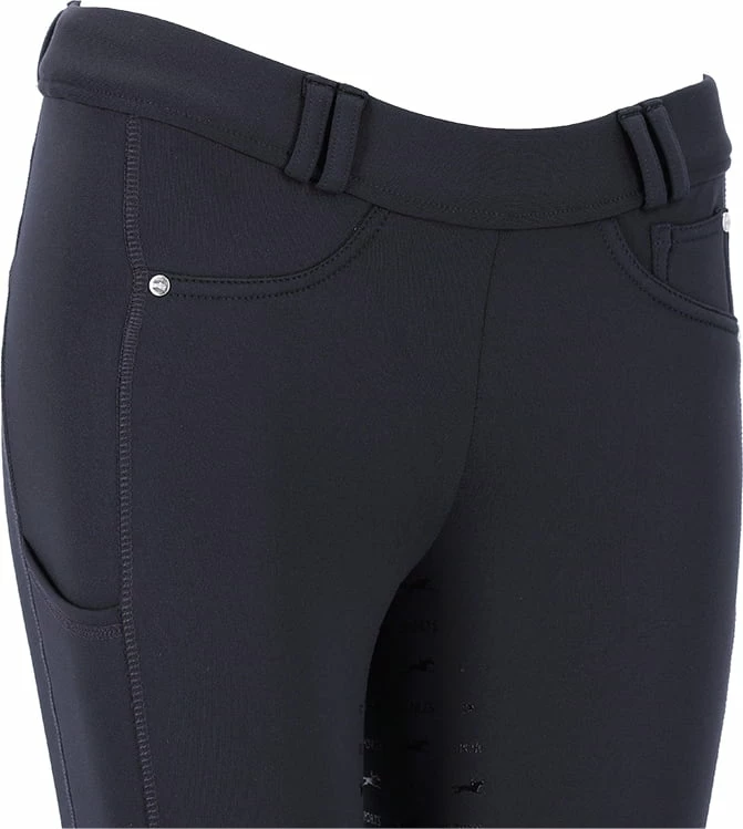 - At the back, elegant dividing seams finished with overlock stitching and two welt pockets with silver piping round off the elegant design. These leggings are functional, stylish and comfortable for winter riding.