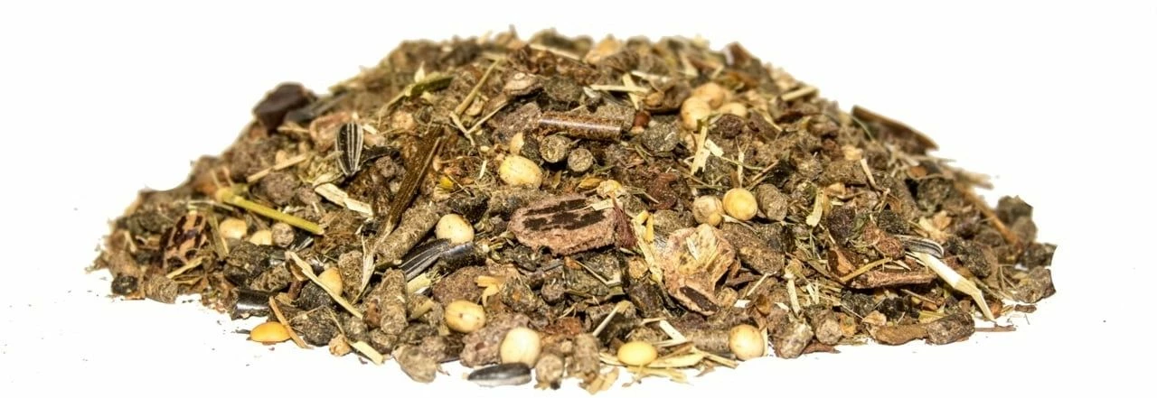 - The feed contains oleaginous fruit (flax, sunflower, soybeans – all naturally GMO-free!), as well as pro- and prebiotics that can have a positive effect on digestion. Fruits and vegetables contribute vitamins to the mix and alfalfa and grasses give the feed structure. Additionally, the feed is made without molasses or grain.