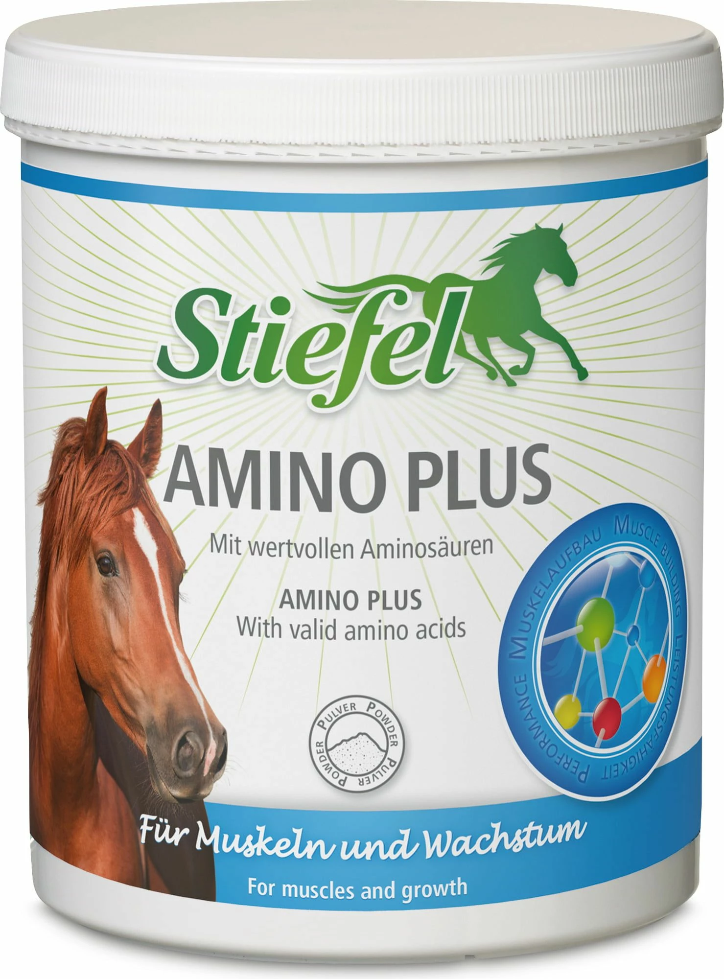 Amino Plus contains many essential amino acids and minerals and is used to support muscle development and performance in sport horses. In foals and young horses, the even build-up of bone structure and musculature can be supported during the growth phase. Older horses and horses in convalescence can also be supported in their maintenance and development by feeding Stiefel Amino Plus. The whole body and especially the muscles consist of proteins. Proteins in turn are composed of amino acids. The horse can partly produce these itself in the intestine. Some of them have to be ingested with food. In order to build up proteins, all amino acids (about 20 in total) must be sufficiently present in the body. If there is a deficiency, protein synthesis is restricted and deficiencies occur, for example in muscle building and performance. Stiefel Amino Plus contains lysine HCL, DL-methionine, sodium chloride, magnesium chloride, L-threonine, tryptophan. L-tryptophan, for example, is an essential amino acid. The effect of L-tryptophan is based on the fact that it is converted into serotonin in the metabolism. It is one of the few amino acids that can easily cross the blood-brain barrier. The effect is described as mood-lifting and calming. An undersupply of L-tryptophan leads to overexcitement, imbalance and a lack of readiness to conduct, especially in stressful situations…. Please observe the current doping guidelines (ADMR) of the FN.