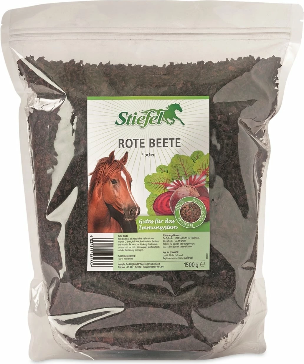 Since ancient times, the Germans have regarded beetroot as a medical herb that supports blood formation. The high iron content and the betanin that provides the red colour of the beetroot stimulate blood formation, can prevent anaemia and support regeneration. Beetroot furthermore provides a natural supply of Vitamin C, B vitamins, calcium and folic acid. Beetroot flakes are well-suited as supplementary feed to increase the iron and trace element content of the feed in a natural way and to support the body’s immune system.