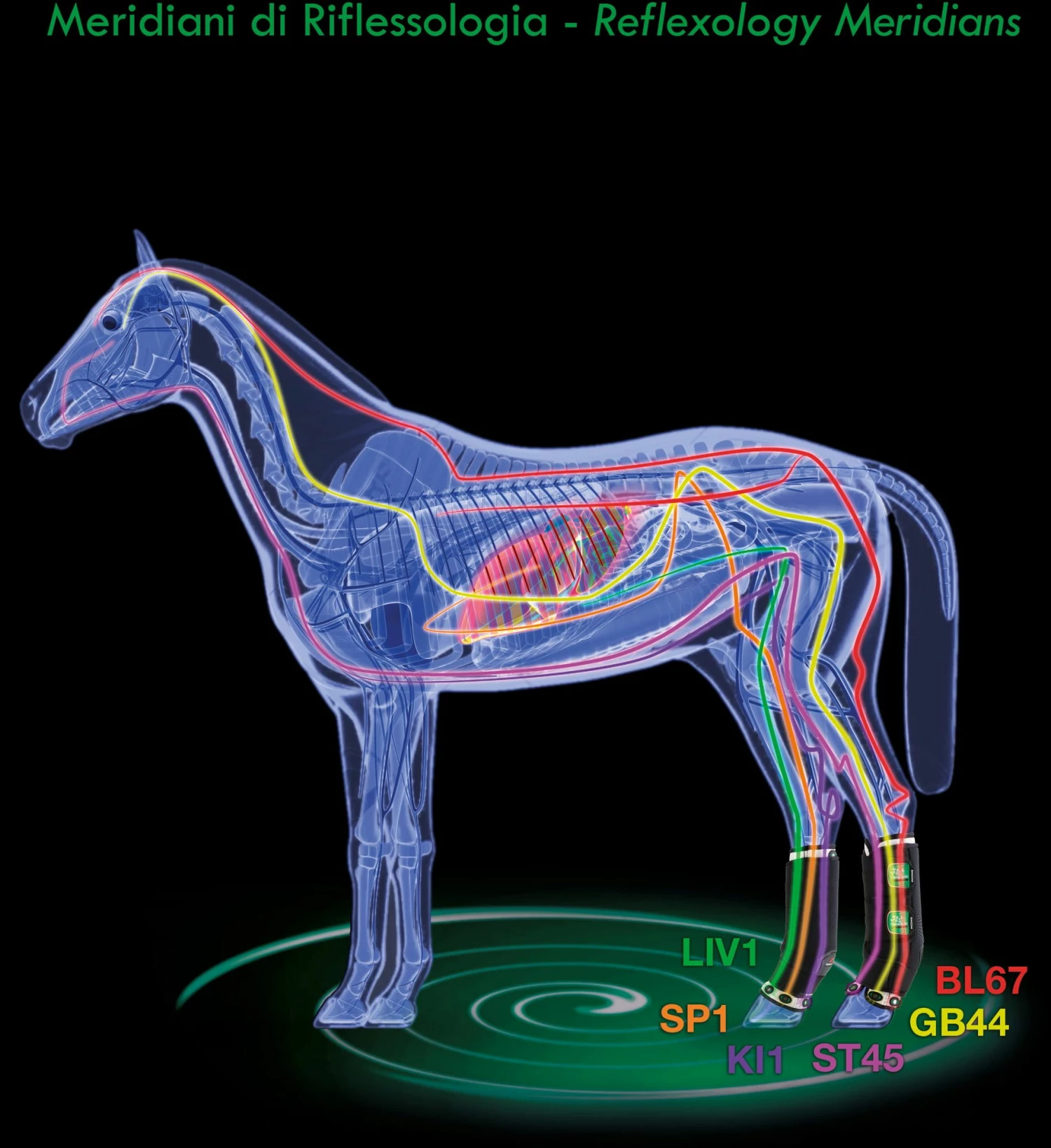 - By using reflexology principles, or magnetically stimulating the reflex points (Ting) along specific meridians of the horse’s body (the same points used for acupuncture), some moderate rebalancing effects could be seen: